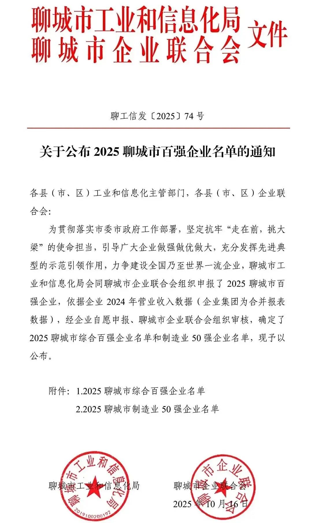 近日,聊城市工业和信息化局、聊城市企业联合会公布了“2025聊城市综合百强、2025聊城市制造业50强企业名单”。信通铝业综合百强企业排名由2024年第17位跃升至第13位、制造业50强排名由2024年第15位跃升至第11位。